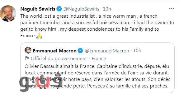 ونعى الرئيس الفرنسي إيمانويل ماكرون، داسو، في تغريده على حسابه بموقع التدوينات تويتر، وقال: ”موته المفاجئ بخسارة كبيرة.. أحب أوليفييه داسو، فرنسا، وكان كابتن صناعة، ونائبا، ومسؤولا محليا منتخبا، وقائد احتياط في سلاح الجو“.