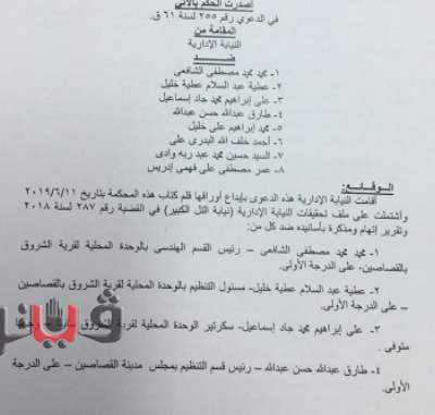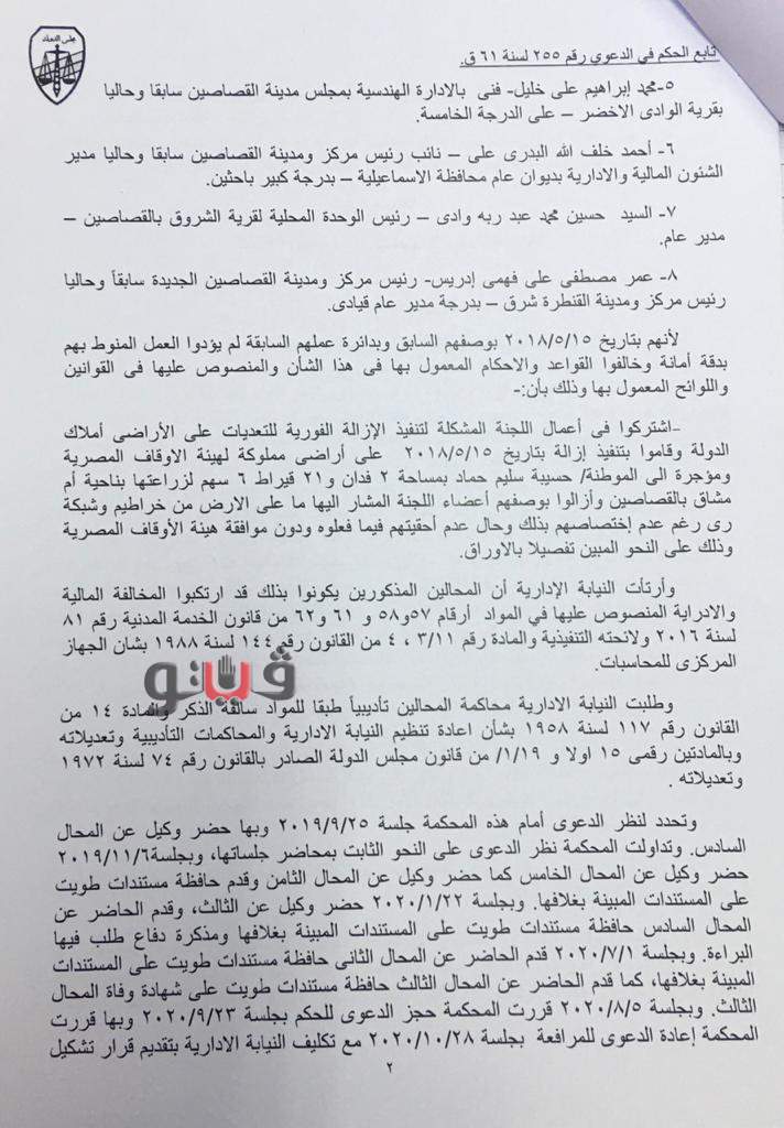 قائمة المحالين الصادر بحقهم حكم البراءة شملت كلًا من محمد مصطفى الشافعي، رئيس القسم الهندسي بالوحدة المحلية لقرية الشروق وعطية عبد السلام خليل، مسئول التنظيم وعلي إبراهيم محمد، سكرتير الوحدة المحلية وطارق عبد الله حسن، رئيس قسم التنظيم بمجلس مدينة القصاصين ومحمد إبراهيم علي، فني بالإدارة الهندسية بقرية الوادي الأخضر وأحمد خلف البدري، مدير الشئون المالية والإدارية بديوان محافظة الإسماعيلية والسيد حسين محمد، رئيس الوحدة المحلية لقرية الشروق بالقصاصين وعمر مصطفى علي، رئيس مركز ومدينة القنطرة شرق.
