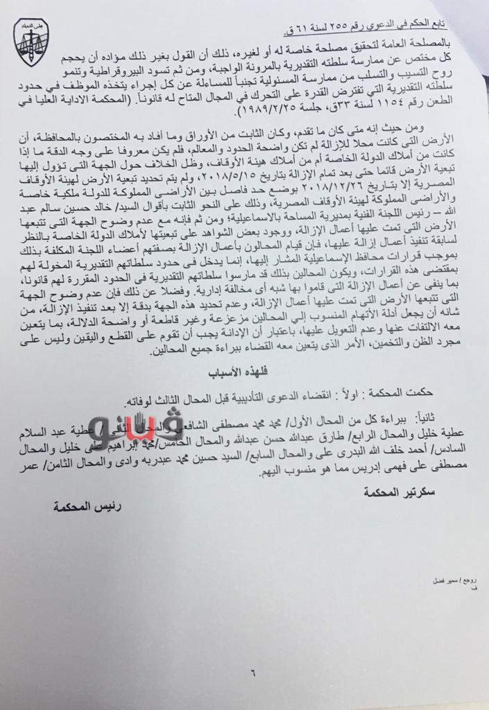 انتهت المحكمة التأديبية العليا بمجلس الدولة إلى حكمها ببراءة رئيس مركز ومدينة القنطرة شرق ومدير الشئون المالية والإدارية بديوان محافظة الإسماعيلية و6 مسئولين آخرين بعد ثبوت عدم تعديهم على أراضي هيئة الأوقاف المصرية.. وعدم ارتكابهم مخالفات مالية وإدارية وقانونية جسيمة.