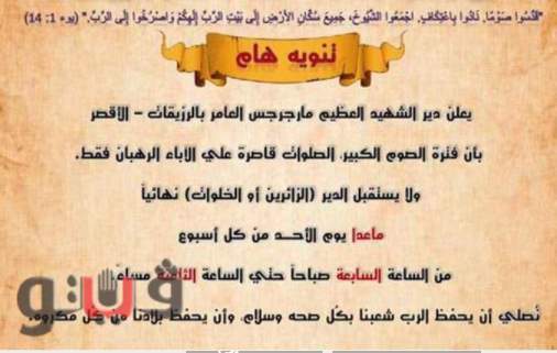 وأضاف البيان إلى حصلت عليه "فيتو"، أن الدير لن يستقبل أي زوار طوال فترة الخلوات نهائيا، ما عدا يوم الأحد من كل أسبوع.