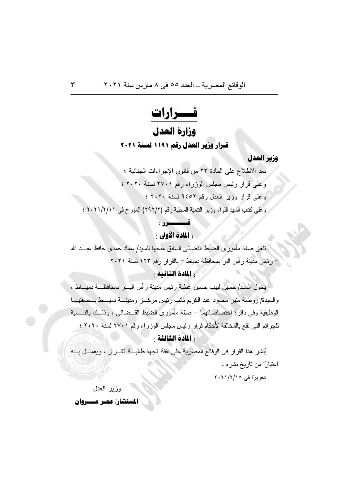 نشرت جريدة الوقائع المصرية في عددها رقم 55، الصادر في 8 مارس 2021، قرار وزير العدل المستشار عمر مروان رقم 1191 لسنة 2021، بإلغاء صفة مأمورى الضبط القضائي السابق رئيس مدينة رأس البر السابق بمحافظة دمياط، ومنحها لرئيس مدينة رأس البر الحالي ونائب رئيس مركز ومدينة دمياط.