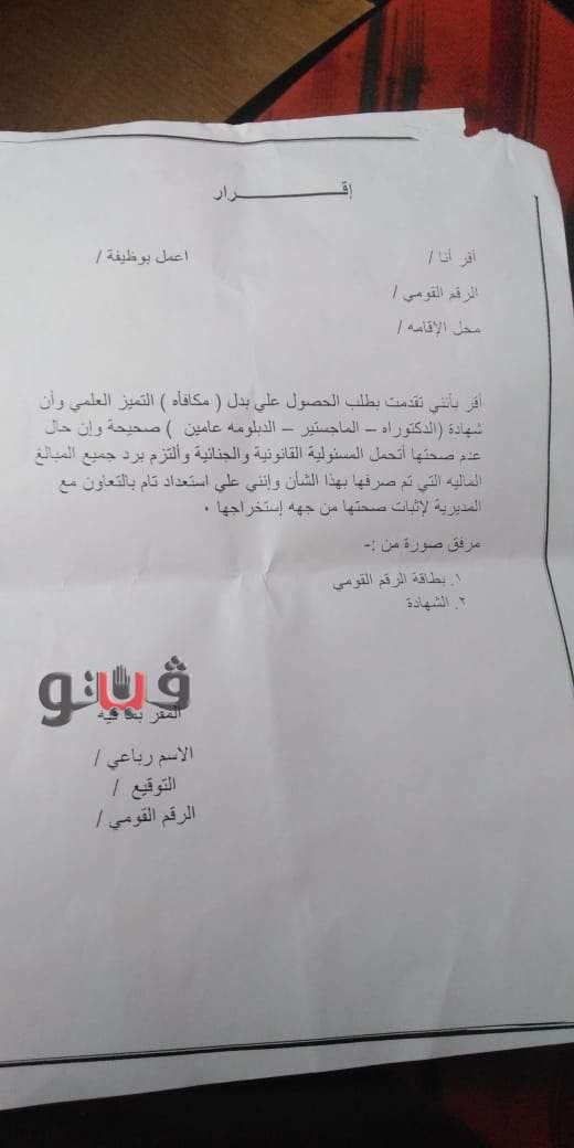 وطالبت وزارة الأوقاف بتوقيع الأئمة على الإقرار الذي ينص على: "أقر بأنني تقدمت على بطلب الحصول على بدل مكافأة التميز العلمي، وأن شهادة "الدكتوراه - الماجستير - الدبلومة عامين" صحيحة وفي حال عدم صحتها أتحمل المسئولية القانونية والجنائية وألتزم برد جميع المبالغ التي تم صرفها بهذا الشأن وإنني على استعداد تام بالتعاون مع المديرية لاثبات صحتها من جهة استخراجها".