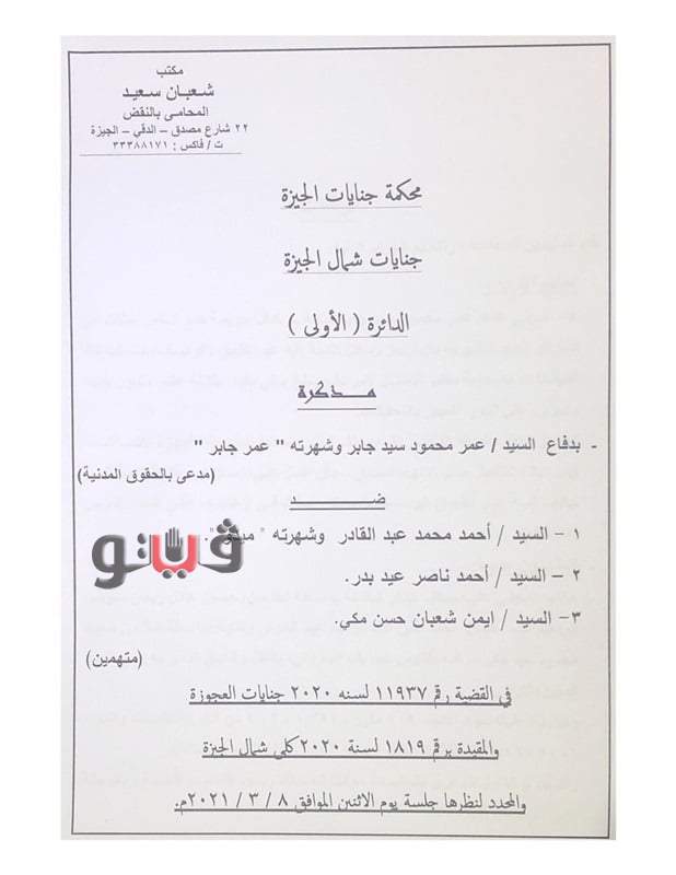قدم شعبان سعيد، المحامي، ودفاع اللاعب عمر جابر، مذكرة بشأن تنازل اللاعب عمر جابر، لاعب نادى "بيراميدز"، عن الدعوى المدنية والجنائية المرفوعة من جانبه ضد المتهمين بتهديده بالقتل والإيذاء.