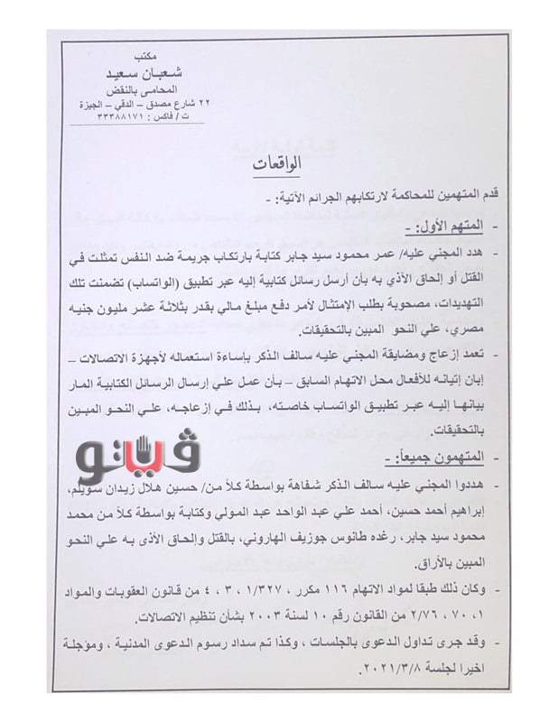 وجاء بمذكرة التنازل أن وقائع الدعوى تلخصت في تهديد المتهم الأول للمجني عليه كتابة بارتكاب جريمة ضد النفس، تمثلت في القتل أو إلحاق الأذى به، بأن أرسل رسائل كتابية له عبر تطبيق الـ"واتس آب"، تضمنت تلك التهديدات، مصحوبة بطلب الامتثال لأمر دفع مبلغ مالى بقدر 13 مليون جنيه مصري، على النحو المبين بالتحقيقات.