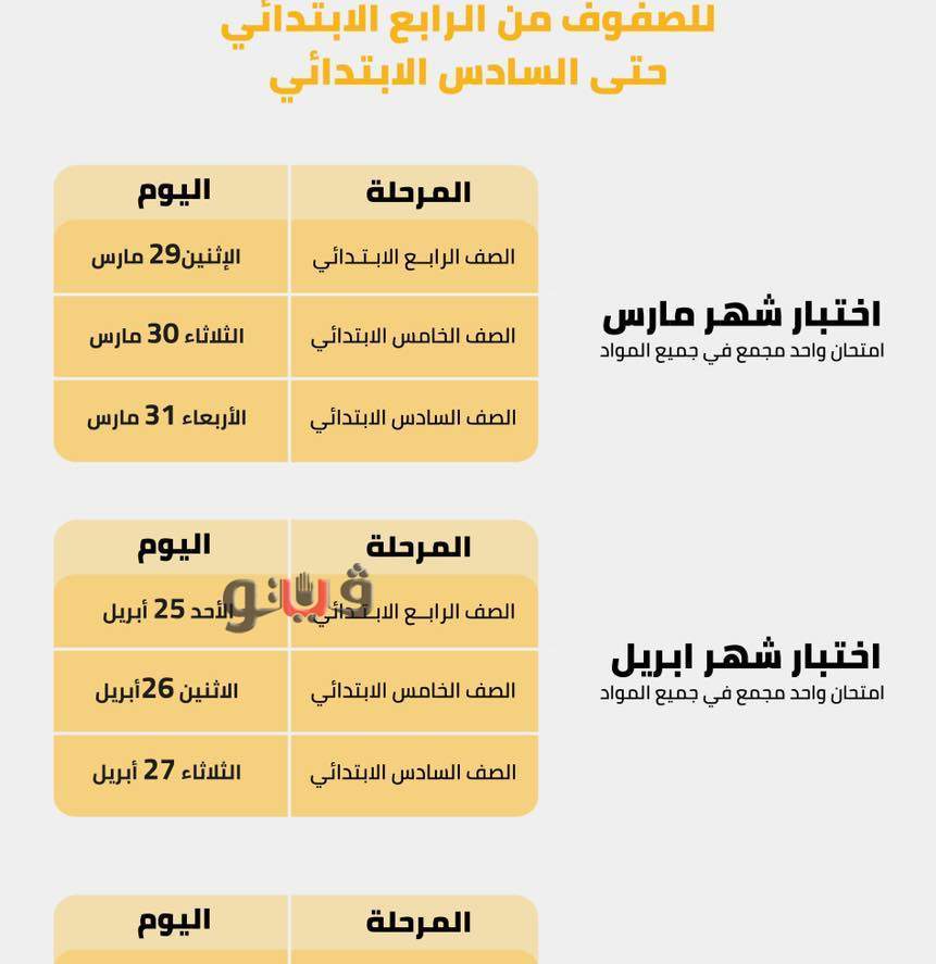 مواعيد اختبارات شهر مارس للمرحلة الابتدائية: