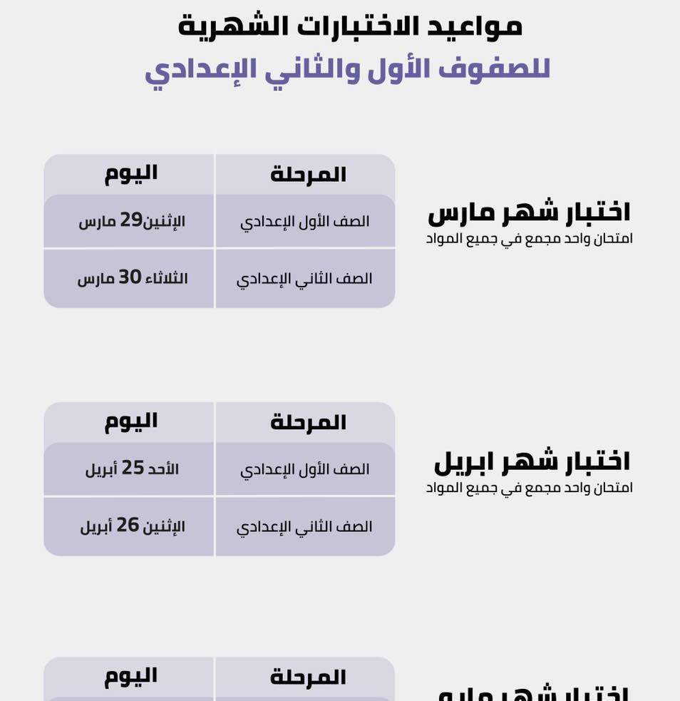 مواعيد اختبارات شهر مارس للصفوف الأول والثاني الإعدادي: