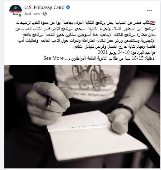 كتبت السفارة الأمريكية بالقاهرة تدوينة على الفيس بوك "كتّاب مصر من الشباب! يعلن برنامج الكتابة الدولي بجامعة أيوا عن دعوة لتقديم ترشيحات لبرنامج "بين السطور: السلام وتجربة الكتابة".
