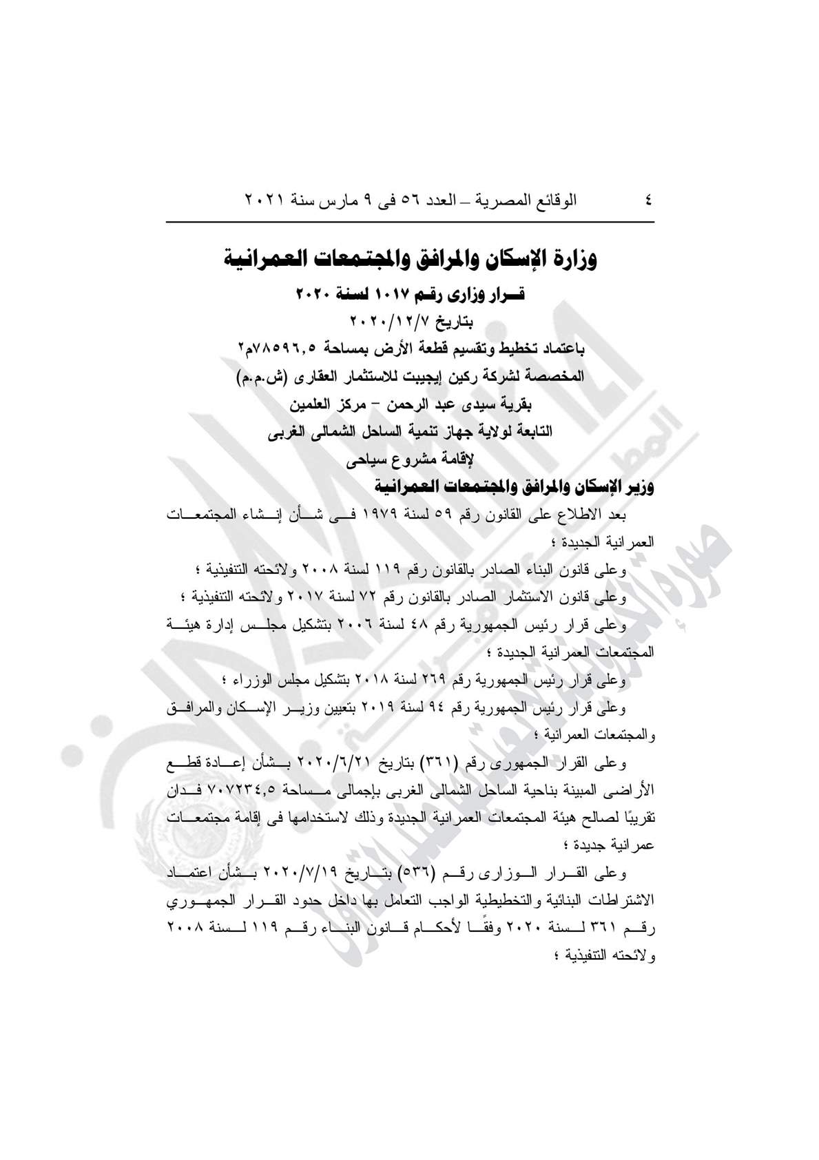 نشرت جريدة الوقائع المصرية في عددها رقم 56، الصادر في 9 مارس عام 2021، قرار وزارة الإسكان والمرافق والمجتمعات العمرانية رقم 1017 لسنة 2020، بشأن تخطيط وتقسيم قطعة أرض بمساحة 78596.5 متر مربع المخصصة لشركة ركين إيجيبت للاستثمار العقارى بقرية سيدى عبد الرحمن مركز العلمين التابعة لولاية جهاز تنمية الساحل الشمالى الغربى لإقامة مشروع سياحى.