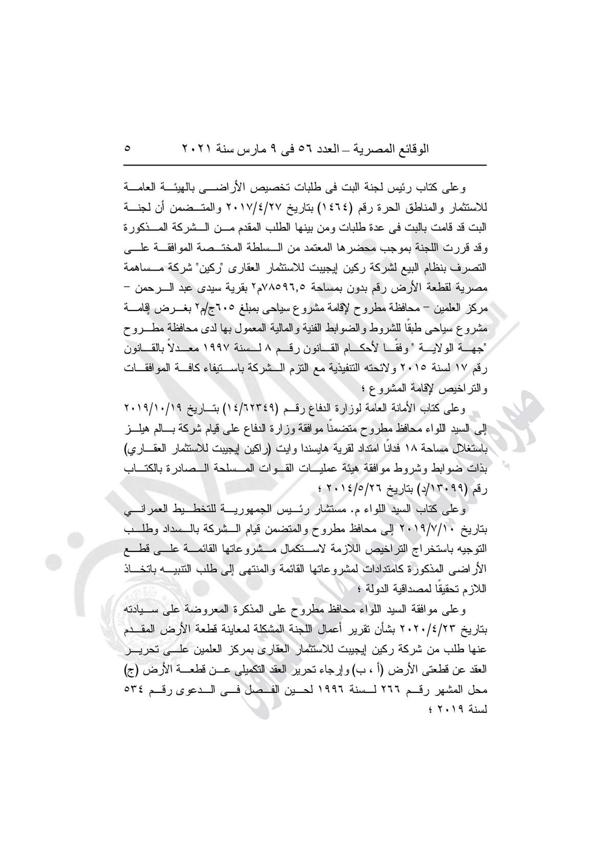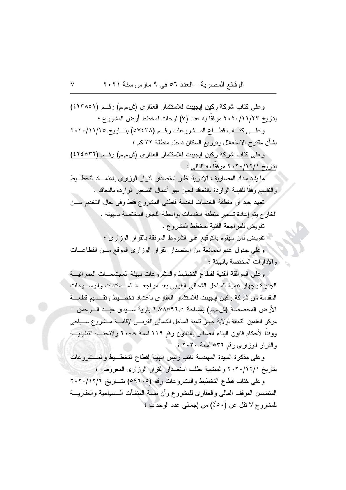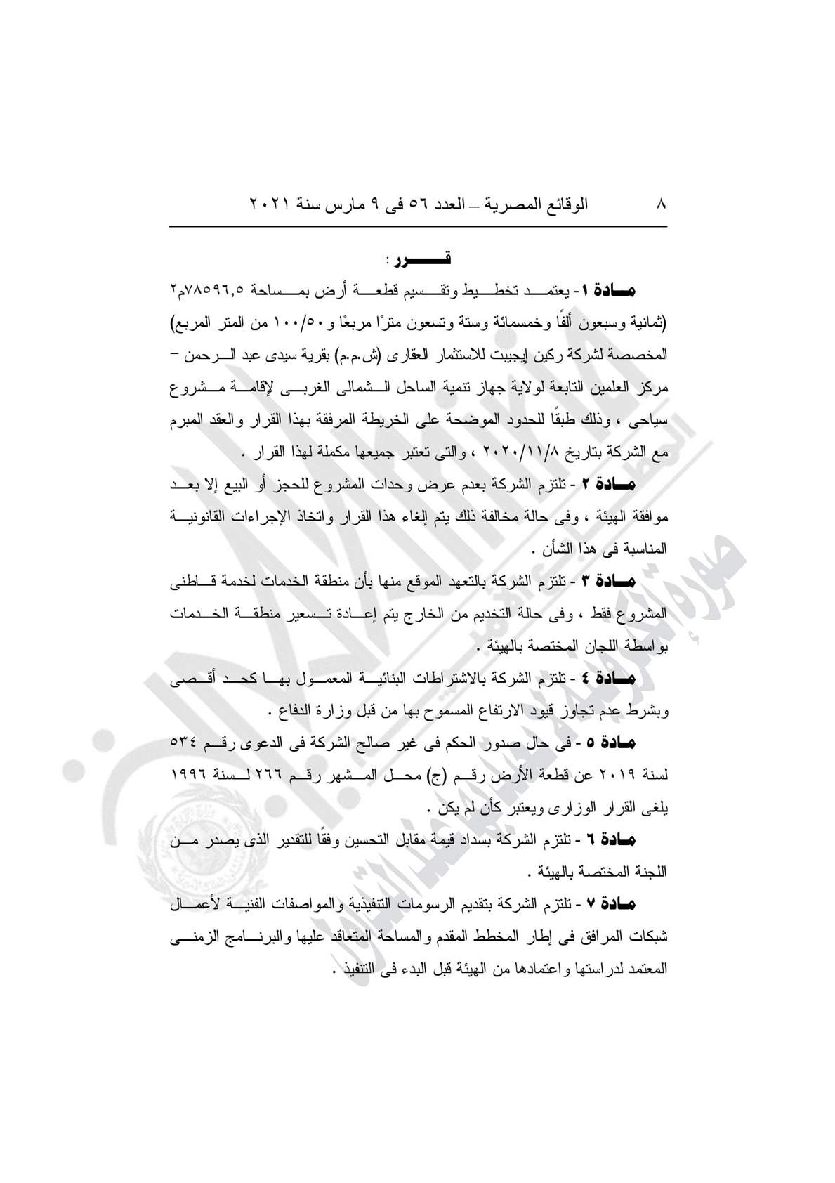 وتنص المادة الأولى على أن يعتمد تخطيط وتقسيم قطعة أرض بمساحة 78596.5متر مربع و50/100 من المتر المربع المخصصة لشركة ركين إيجيبت للاستثمار العقارى (ش.م.م) بقرية سيدى عبد الرحمن، مركز العلمين التابعة لولاية جهاز تنمية الساحل الشمالى الغربى لإقامة مشروع سياحى، وذلك طبقًا للحدود الموضحة على الخريطة المرفقة بهذا القرار والعقد المبرم مع الشركة بتاريخ 8/11/2020 ، والتى تعتبر جميعها مكملة لهذا القرار.