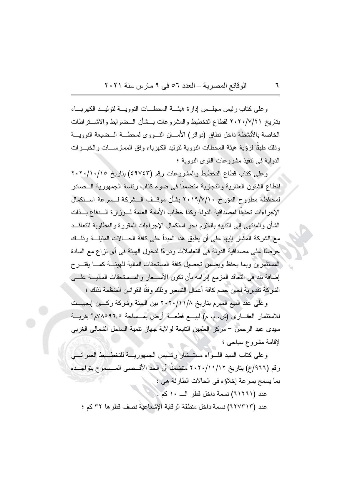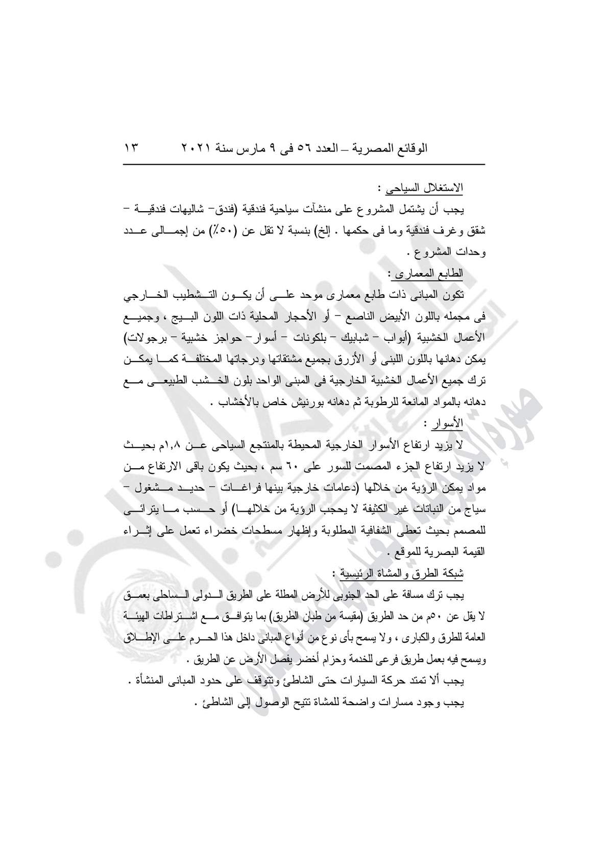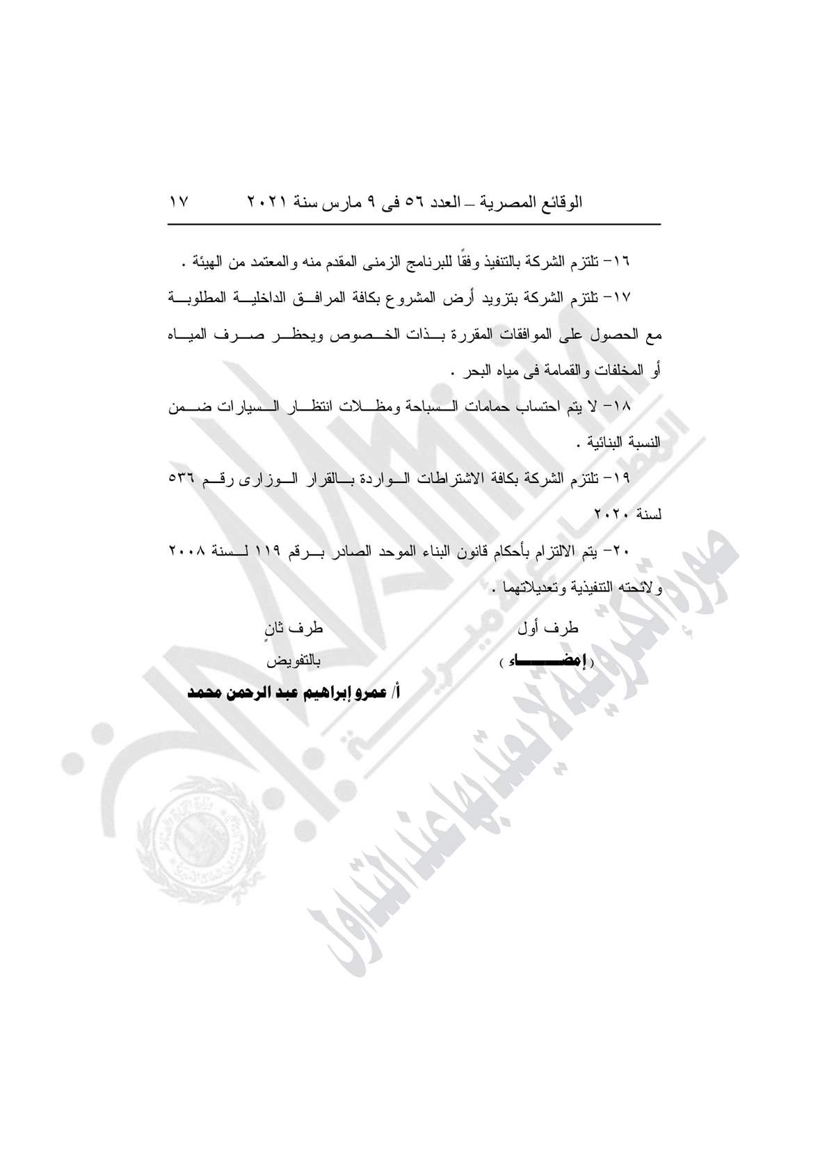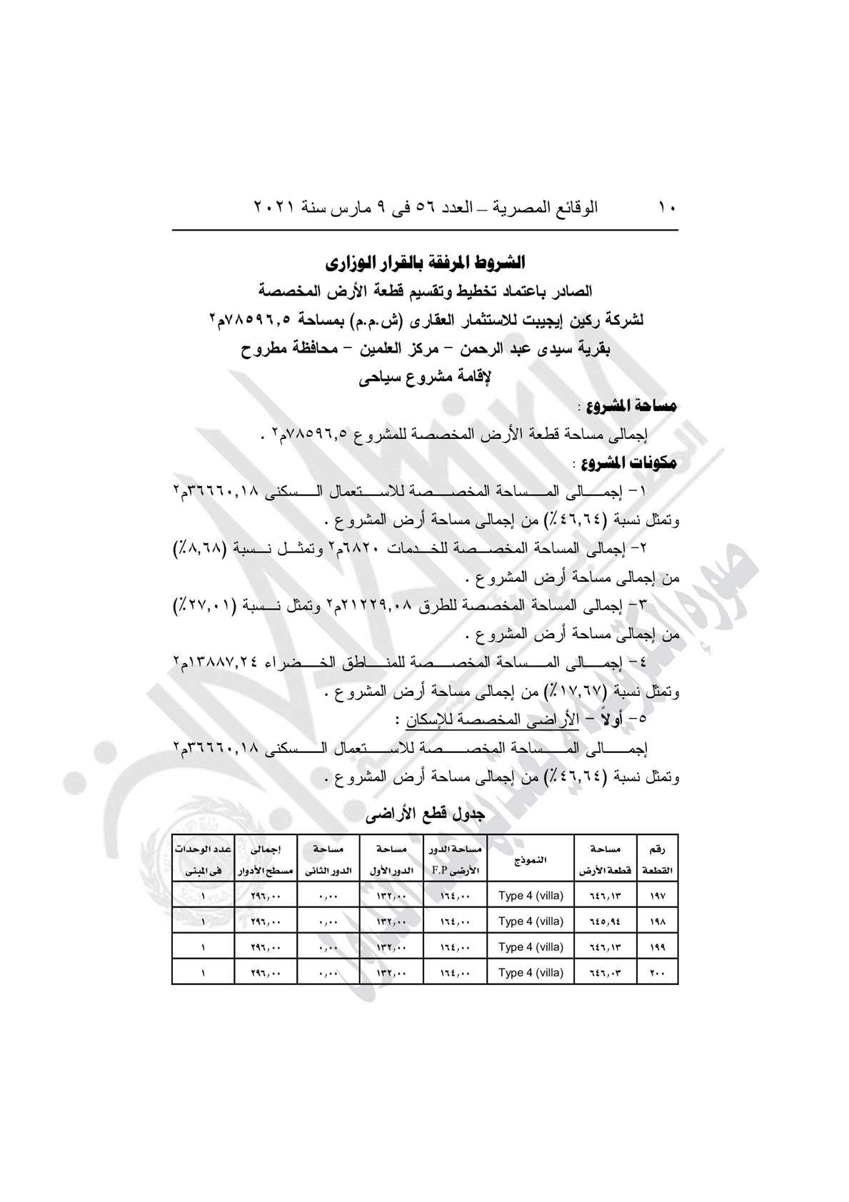 وتنص المادة الأولى على أن يعتمد تخطيط وتقسيم قطعة أرض بمساحة 78596.5متر مربع و50/100 من المتر المربع المخصصة لشركة ركين إيجيبت للاستثمار العقارى (ش.م.م) بقرية سيدى عبد الرحمن، مركز العلمين التابعة لولاية جهاز تنمية الساحل الشمالى الغربى لإقامة مشروع سياحى، وذلك طبقًا للحدود الموضحة على الخريطة المرفقة بهذا القرار والعقد المبرم مع الشركة بتاريخ 8/11/2020 ، والتى تعتبر جميعها مكملة لهذا القرار.
