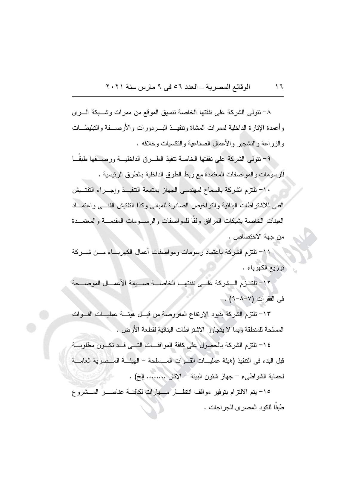 وتلتزم الشركة بتقديم الرسومات التنفيذية والمواصفات الفنية لأعمال شبكات المرافق فى إطار المخطط المقدم والمساحة المتعاقد عليها والبرنامج الزمنى المعتمد لدراستها واعتمادها من الهيئة قبل البدء فى التنفيذ، وتلتزم الشركة بموافاة جهاز المدينة المختص بالمستندات اللازمة لاستخراج التراخيص طبقًا لأحكام قانون البناء الصادر بالقانون رقم 119 لسنة 2008 ولائحته التنفيذية.