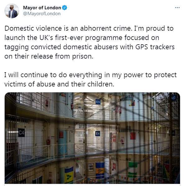 كتب صادق خان تغريدة على تويتر "العنف المنزلي جريمة بشعة: أنا فخور بإطلاق أول برنامج في المملكة المتحدة يركز على وضع علامات على المعتدين المنزليين المدانين بأجهزة تعقب GPS عند إطلاق سراحهم من السجن"