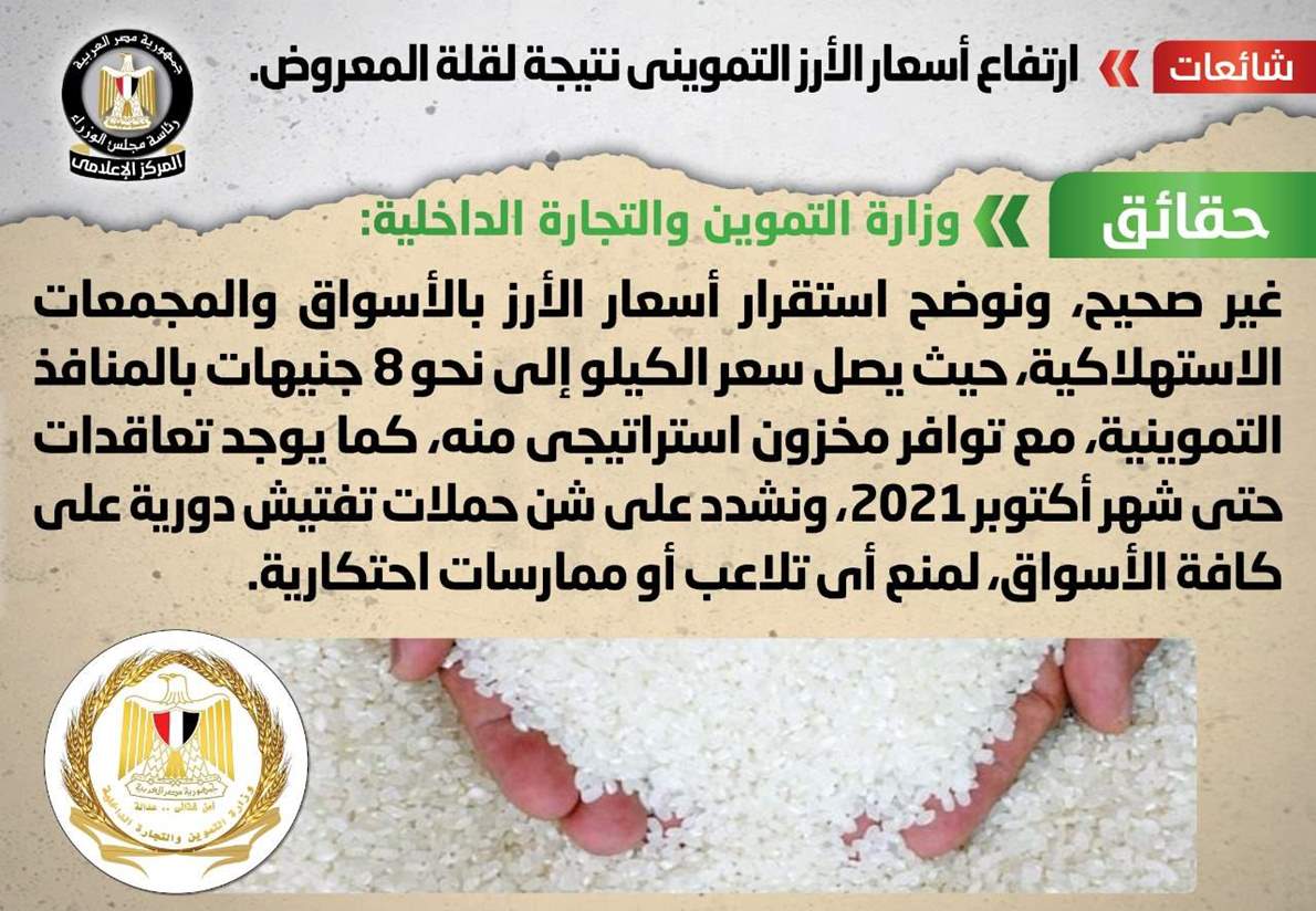 وتواصل المركز الإعلامي لمجلس الوزراء مع وزارة التموين والتجارة الداخلية، والتي نفت تلك الأنباء، مُؤكدةً أنه لا صحة لارتفاع أسعار الأرز التمويني نتيجة لقلة المعروض.