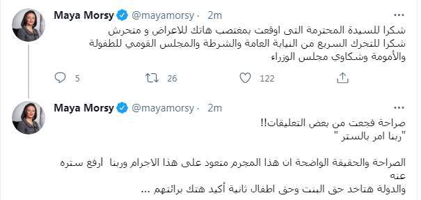 وأضافت: "شكرا للسيدة المحترمة التي أوقعت بالمغتصب هاتك الأعراض والمتحرش شكرا للتحرك السريع من النيابة العامة والشرطة والمجلس القومي للطفولة والأمومة وشكاوى مجلس الوزراء".
