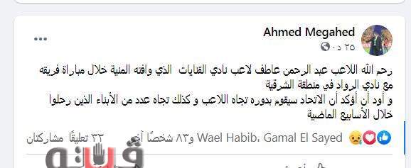 نشر مجاهد عبر حسابه الشخصي "فيس بوك" ناعيا: "رحم الله اللاعب عبد الرحمن عاطف لاعب نادي القنايات الذي وافته المنية خلال مباراة فريقه مع نادي الرواد في منطقة الشرقية.