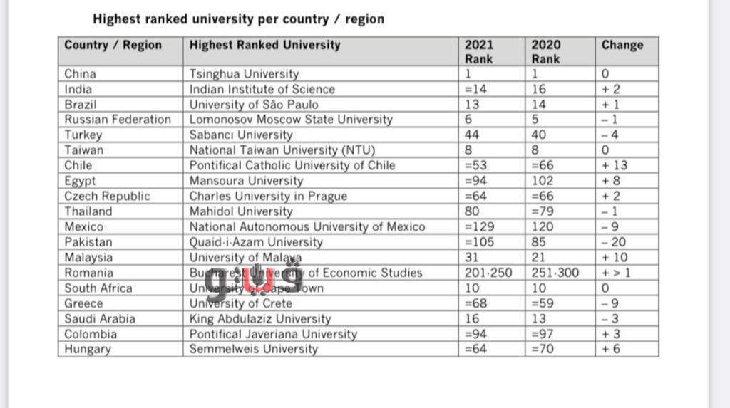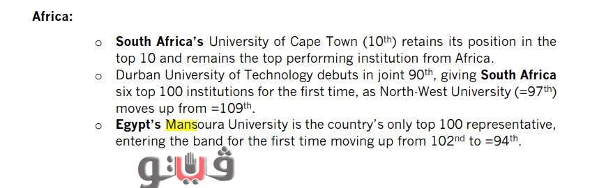 و صنفت جامعة المنصورة وهى الجامعة المصرية الوحيدة في الترتيب العالمي ضمن أفضل 100 جامعة على مستوى العالم وقد حافظت جامعة المنصورة على تميزها وصدارتها محليا وتقدمت عالميا ٨ مراكز لتصبح في المركز الي ٩٤ في عام ٢٠٢١ بدلا من ١٠٢ في عام ٢٠٢٠ ، كما احتلت الجامعة المركز الأول على مستوى الجامعات المصرية للعام الثالث على التوالي.