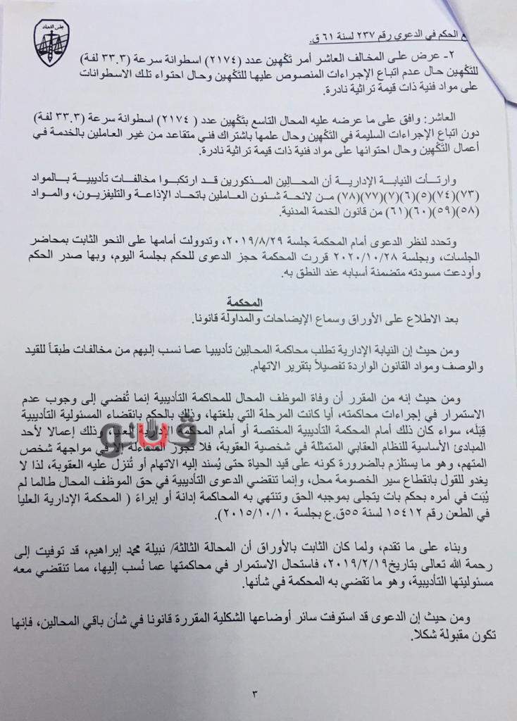 تضمنت حيثيات الحكم في القضية رقم 237 لسنة 61 قضائية عليا أن سلوى أنور محمد وخضرة محمد إبراهيم، أمناء مكتبة الأسطوانات العربي بقطاع الإذاعة وميرفت على عوض، مسئولة بالشبكات التعليمية والمكتبات بإذاعة الشرق الأوسط بوصفهم الوظيفي قمن بتكهين 8 أسطوانات نوعية 78 لفة دون إخطار قطاع الشئون المالية والاقتصادية.
