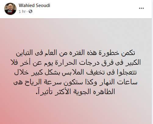 واختتم وحيد سعودي: "تكمن خطورة هذه الفتره من العام فى التباين الكبير فى فرق درجات الحرارة يوم عن آخر فلا تتعجلوا فى تخفيف الملابس بشكل كبير خلال ساعات النهار وكذا ستكون سرعة الرياح هى الظاهرة الجوية الأكثر تأثيراً".
