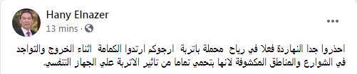 وكتب الدكتور هاني الناظر تدوينة عبر فيس بوك قائلًا: "احذروا جدا النهاردة فعلا في رياح محملة باتربة ارجوكم ارتدوا الكمامة اثناء الخروج والتواجد في الشوارع والمناطق المكشوفة لانها بتحمي تماما من تاثير الاتربة علي الجهاز التنفسي"