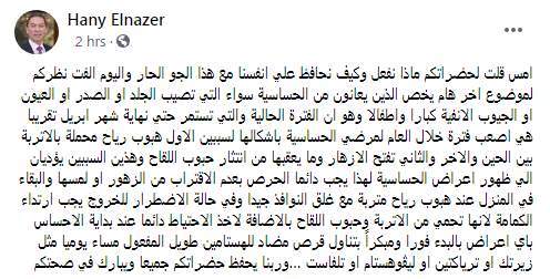 وأضاف "أمس قلت لحضراتكم ماذا نفعل وكيف نحافظ علي انفسنا مع هذا الجو الحار واليوم الفت نظركم لموضوع اخر هام يخص الذين يعانون من الحساسية سواء التي تصيب الجلد أو الصدر أو العيون أو الجيوب الانفية كبارا واطفالا"