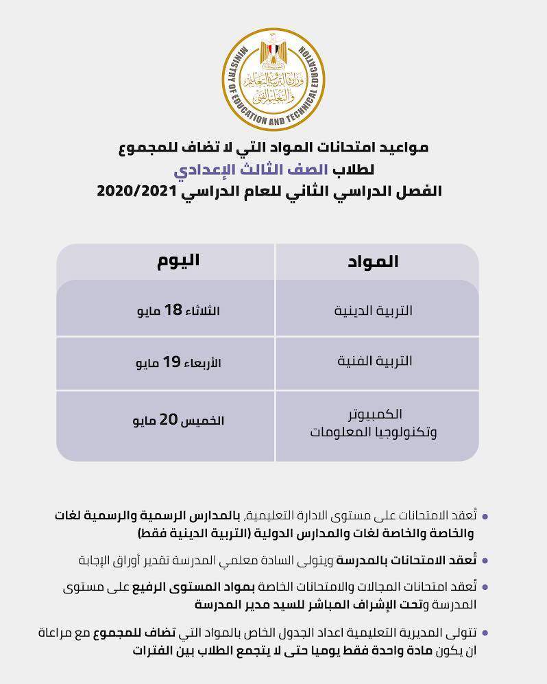 وتُعقد امتحانات مواد (التربية الدينية، التربية الفنية، الكمبيوتر وتكنولوجيا المعلومات) لطلاب الصف الثالث الإعدادي على مستوى الادارة التعليمية، بالمدارس الرسمية والرسمية لغات والخاصة والخاصة لغات والمدارس الدولية (التربية الدينية فقط) في المواعيد التالية: