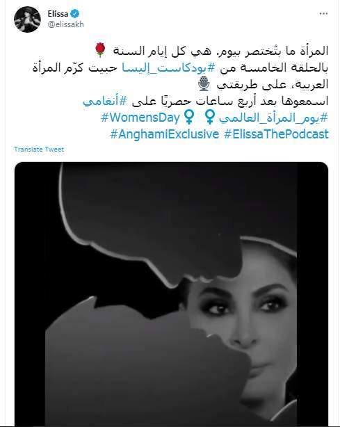 وكتبت إليسا تغريدة على تويتر "المرأة ما بتُختصر بيوم.. هي كل إيام السنة.. بالحلقة الخامسة من #بودكاست_إليسا حبيت كرّم المرأة العربية، على طريقتي اسمعوها بعد أربع ساعات حصريًا على #أنغامي #يوم_المرأة_العالمي"