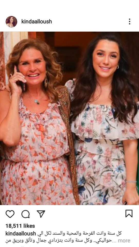 وكتبت كندة تعليقاً على الصورة: كل سنة وأنت الفرحة والمحبة والسند لكل الي حواليكي.. وكل سنة وانت بتزدادي جمال وتألق وبريق من برا ومن جوا.. وكل سنة وانت مثل أعلى لكل فنانة شغوفة بفنها.. وكل سنة وانت معانا أنا وعمرو وحياة جزء أساسي ومهم جداً في حياتنا".