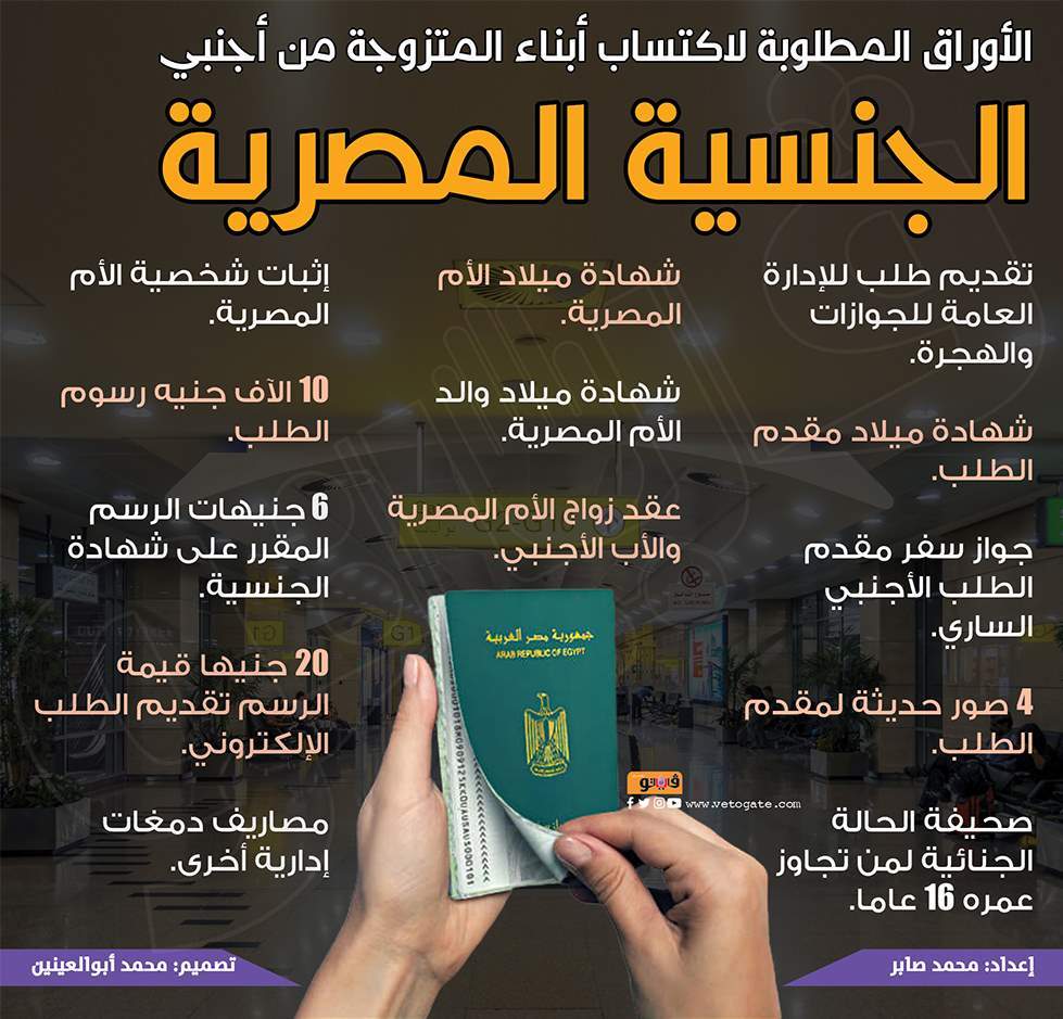 الأوراق المطلوبة لاكتساب أبناء المتزوجة من أجنبي الجنسية المصرية| إنفوجراف الجمعة 12/مارس/2021 - 04:23 م 3/12/2021 4:23:29 PM الجوازات محمد صابر شارك طباعة 18 حجم الخط تعرف على الأوراق المطلوبة لاكتساب الجنسية المصرية لأبناء المتزوجة من أجنبي والرسوم شارك طباعة الجنسية المصرية شهادة ميلاد لادارة العامة للجوازات والهجرة والجنسية