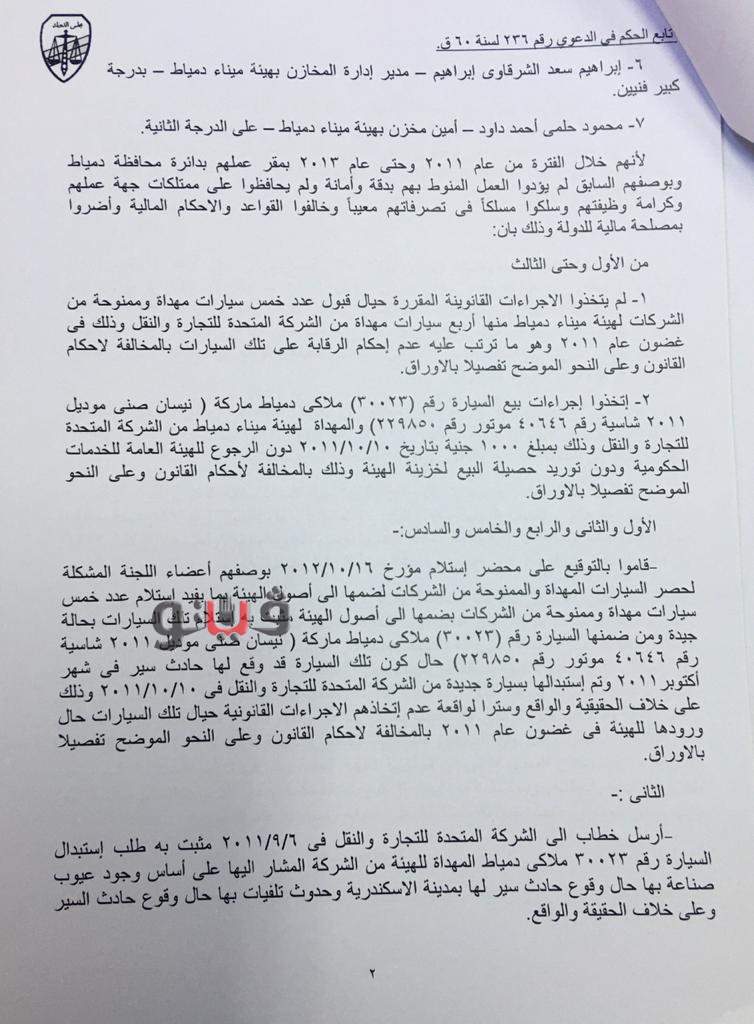 وتبين أن المخالفين من الأول حتى الثالث لم يتخذوا الإجراءات القانونية حيال قبول خمس سيارات مهداة من الشركات لهيئة ميناء دمياط جهة عملهم، منها 4 سيارات مهداة من الشركة المتحدة للتجارة والنقل مما ترتب عليه عدم إحكام الرقابة على تلك السيارات بالمخالفة لأحكام القانون.