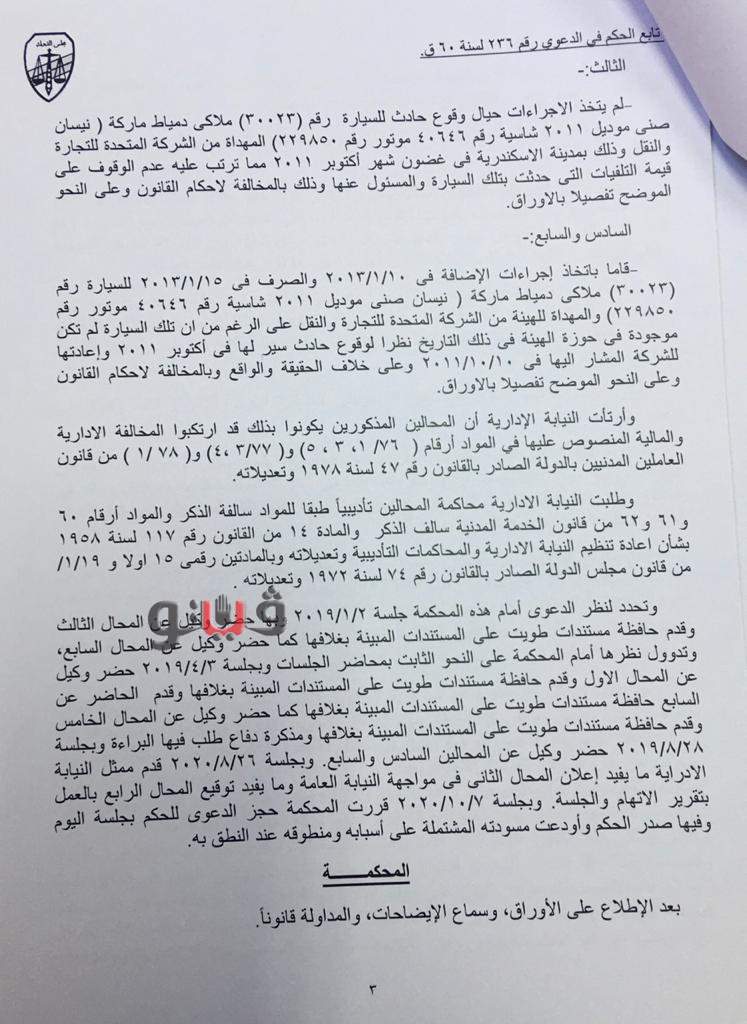 وكشفت أوراق القضية أن الثالث تقاعس عن اتخاذ الإجراءات القانونية حيال وقوع حادث للسيارة بمدينة الإسكندرية وحدوث تلفيات بها مما ترتب عليه عدم الوقوف على قيمة التلفيات التي حدثت بالسيارة والمسئول عنها.