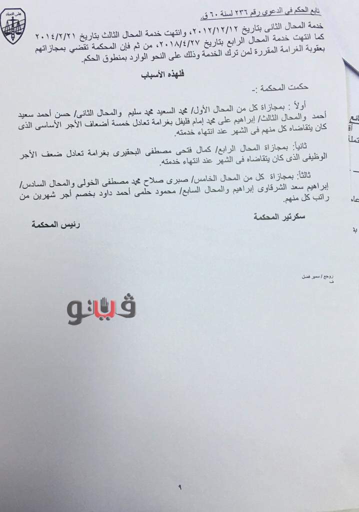 وقضت المحكمة بتغريم كمال فتحي مصطفى، مدير إدارة المركبات ضعف الأجر الوظيفي الذي كان يتقاضاه في الشهر عند انتهاء خدمته، وخصم أجر شهرين من راتب كل من صبري صلاح محمد، فني وإبراهيم سعد الشرقاوي، مدير إدارة المخازن ومحمود حلمي أحمد، أمين مخزن.