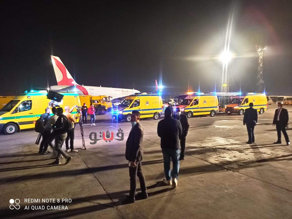 وقامت سيارات إسعاف المطار بنقل المصابين، فور خروجهم من المطار إلى المستشفيات التي تم الاتفاق عليها لبدء العلاج فورا، وذلك بتوجيهات الدكتورة هالة زايد وزيرة الصحة والسكان.