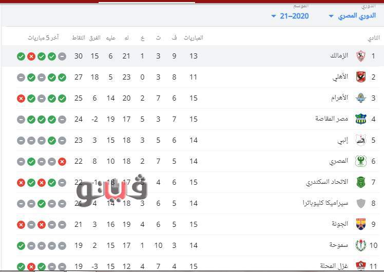 جمع الزمالك في الدوري 30 نقطة من 13 مباراة ينفرد بها بالقمة حتى الآن، لكنه مهدد بقوة من الأهلي الذي يمتلك 24 نقطة من 10 مباريات فقط.