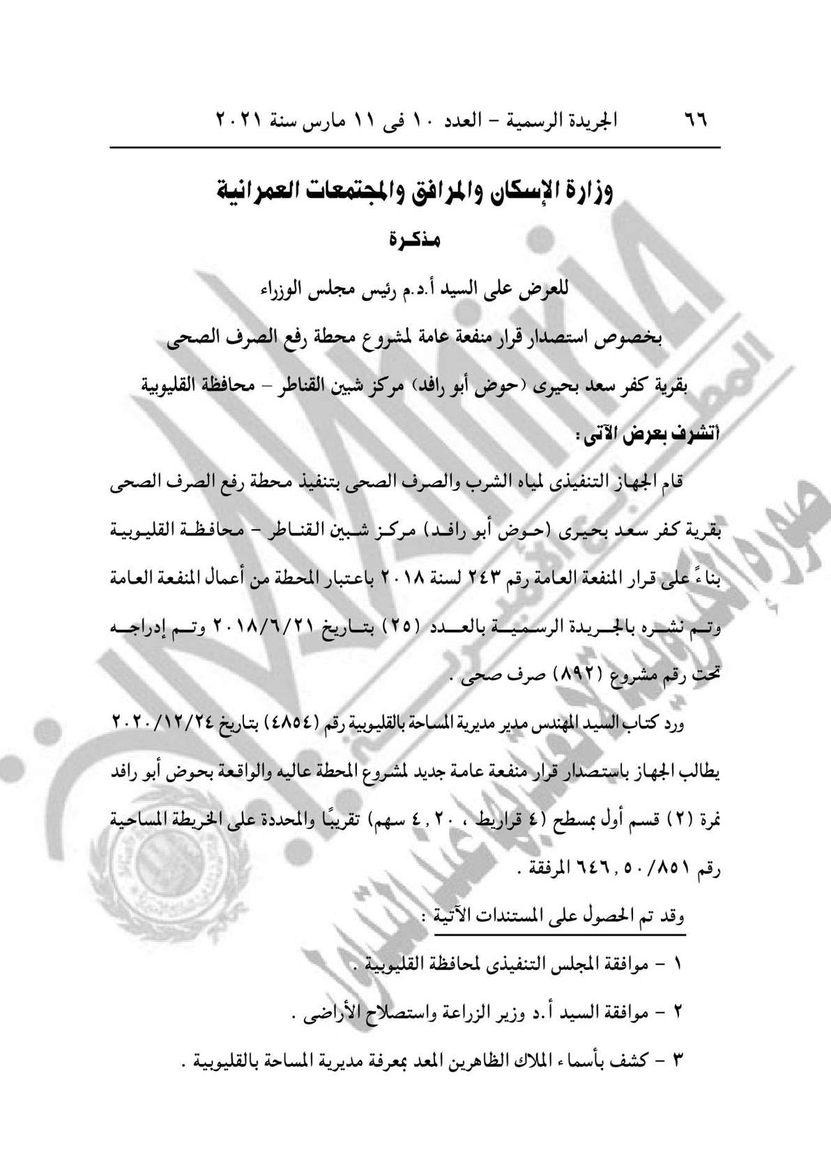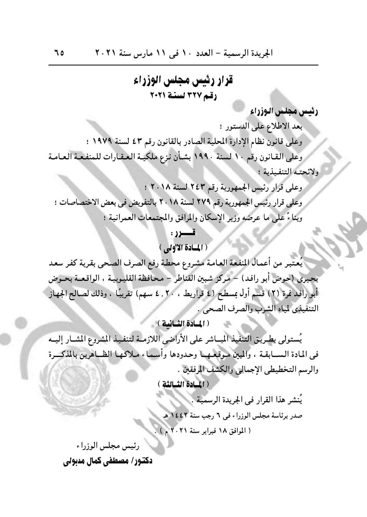 والقرار رقم 327 لسنة 2021، باعتبار مشروع محطة رفع الصرف الصحي بقرية كفر سعد بحيري (حوض أبو رافد) مركز شبين القناطر محافظة القليوبية، من أعمال المنفعة العامة.