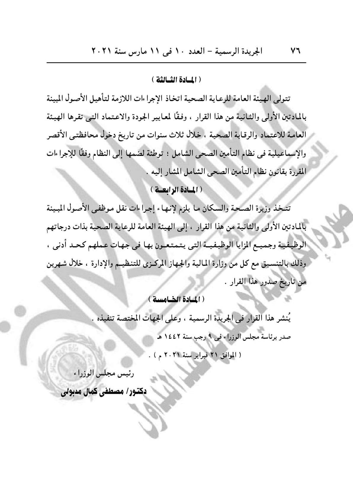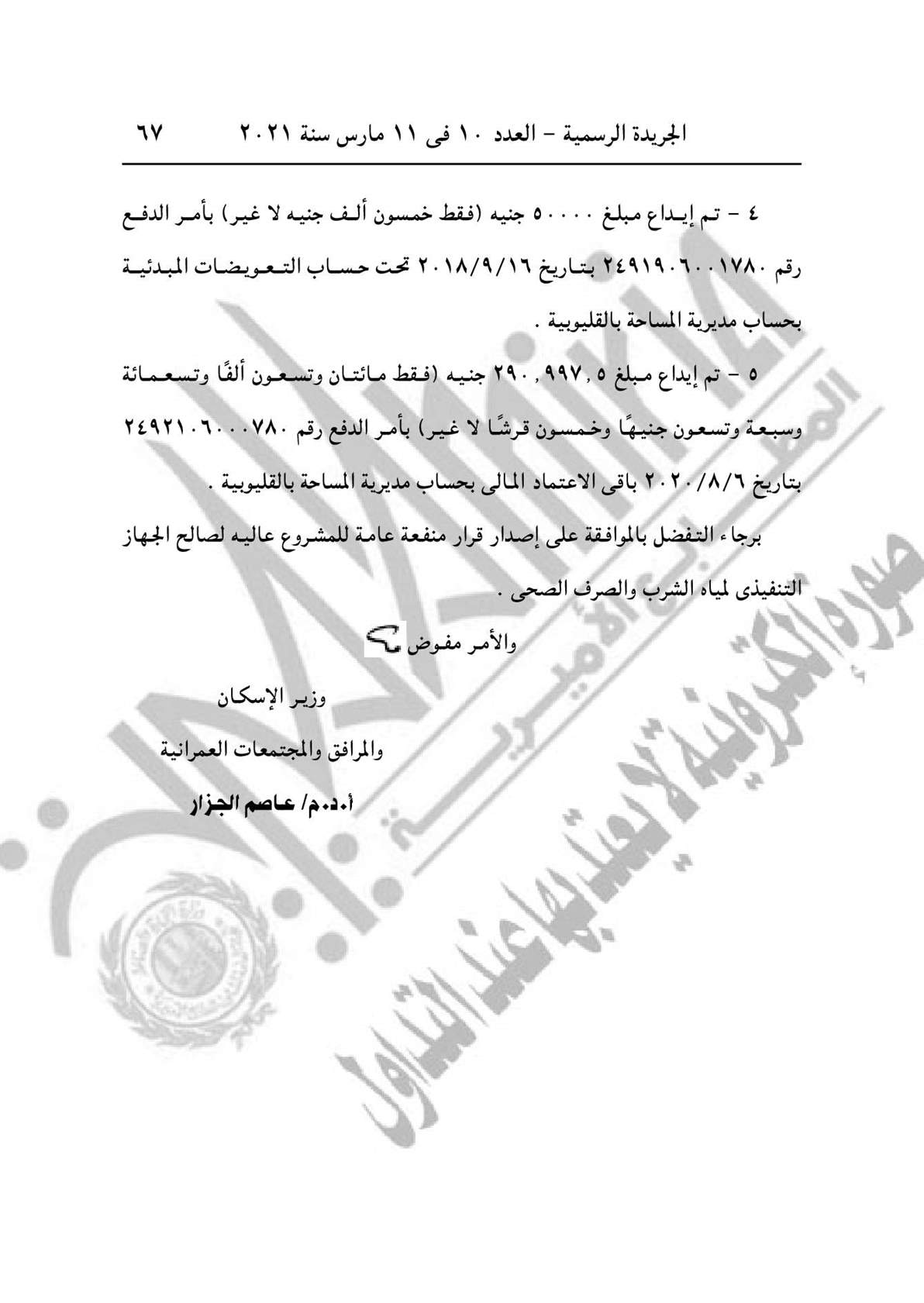 نشرت الجريدة الرسمية في عددها رقم 10، الصادر في 11 مارس 2021، 3 قرارات لرئيس مجلس الوزراء الدكتور مصطفى مدبولي، باعتبار مشروعات الطريق المؤدي إلى خزان مياه الشرب بقرية كوم السمن، ومشروع محطة رفع الصرف الصحي بقرية كفر سعد بحيري بشبين القناطر، وأن تؤل الأصول العلاجية بالأقصر والإسماعيلية لهيئة الرعاية الصحية.