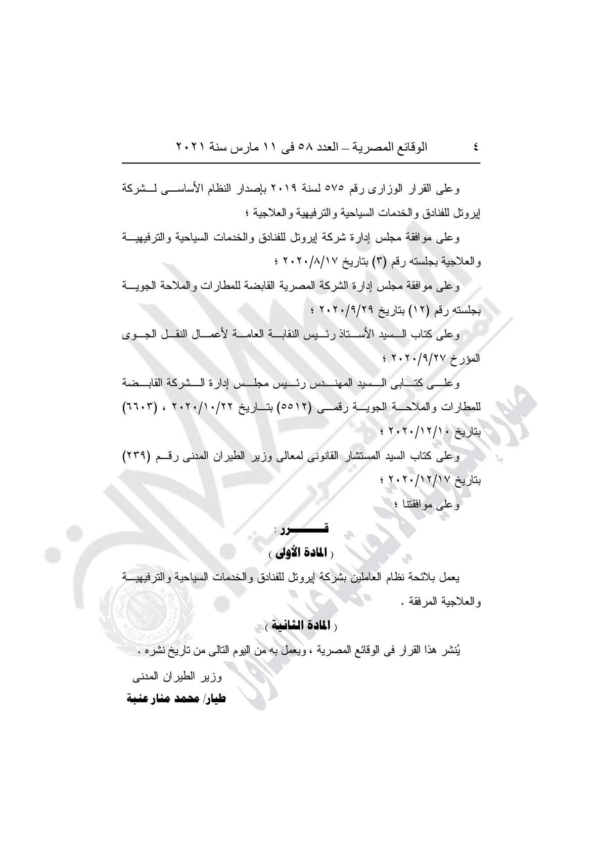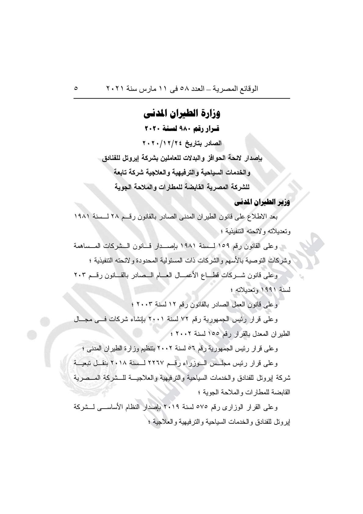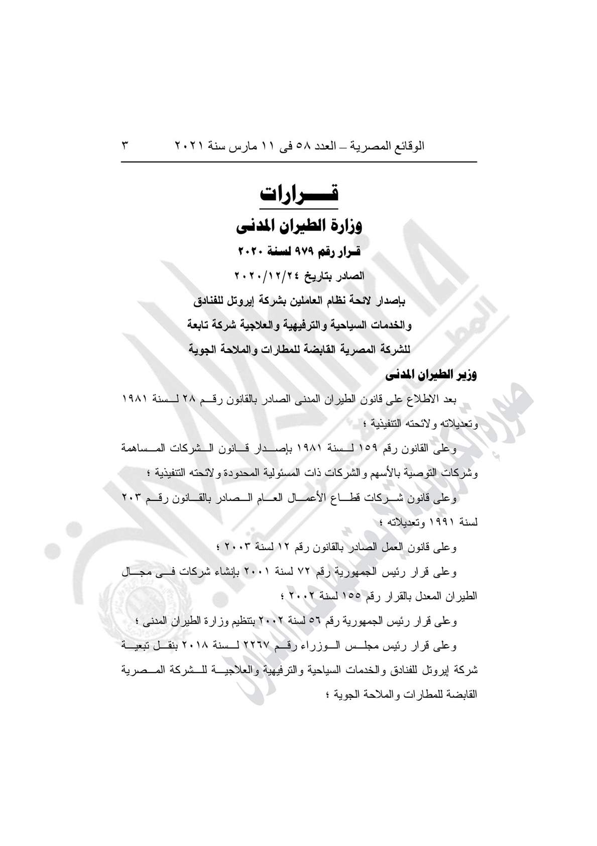 - القرار رقم 979 لسنة 2020، بإصدار لائحة نظام العاملين بشركة إيروتل للفنادق والخدمات السياحية والخدمات السياحية والترفيهية والعلاجية شركة تابعة للشركة المصرية القابضة للمطارات والملاحة الجوية.