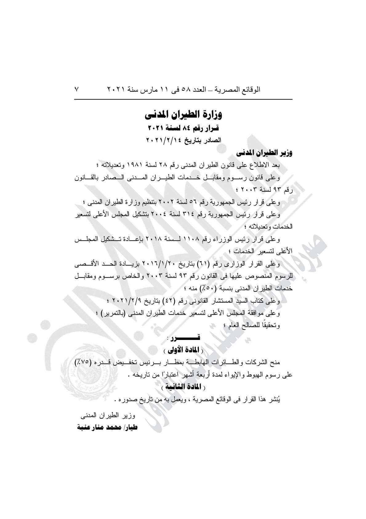- القرار رقم 84 لسنة 2021، بمنح الشركات والطائرات الهابطة بمطار برنيس تخفيض قدره (75%) على رسوم الهبوط والإيواء لمدة أربعة أشهر اعتبارًا من تاريخه.