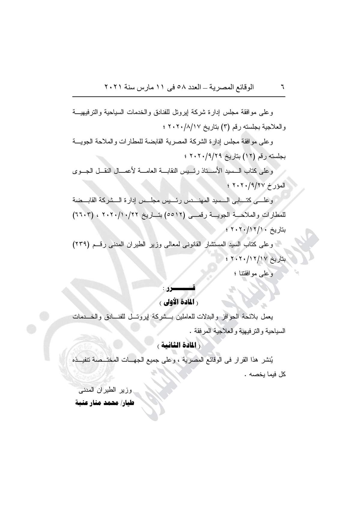 - القرار رقم 980 لسنة 2020، بإصدار لائحة الحوافز والبدلات للعاملين بشركة إيروتل للفنادق والخدمات السياحية والترفيهية والعلاجية شركة تابعة للشركة المصرية القابضة للمطارات والملاحة الجوية.