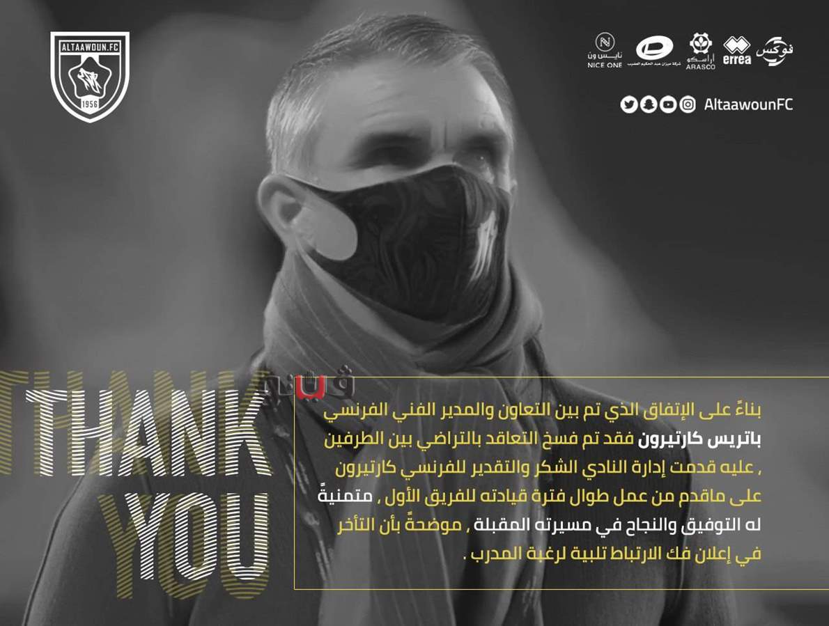 وأصدر نادي التعاون بيانا جاء فيه: "بناء على الاتفاق بين التعاون والمدير الفني الفرنسي باتريس كارتيرون، فقد تم فسخ التعاقد بالتراضي بين الطرفين".