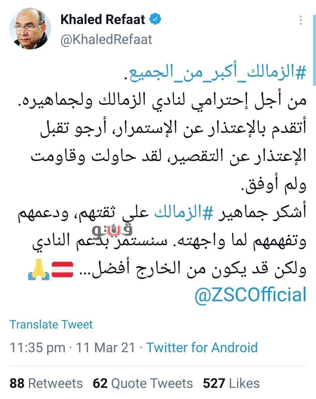 وكتب خالد رفعت عبر حسابه على موقع التواصل الاجتماعي تويتر: "من أجل احترامي لنادي الزمالك ولجماهيره أتقدم بالاعتذار عن الاستمرار، وأرجو تقبل الاعتذار عن التقصير، لقد حاولت وقاومت ولم أوفق".
