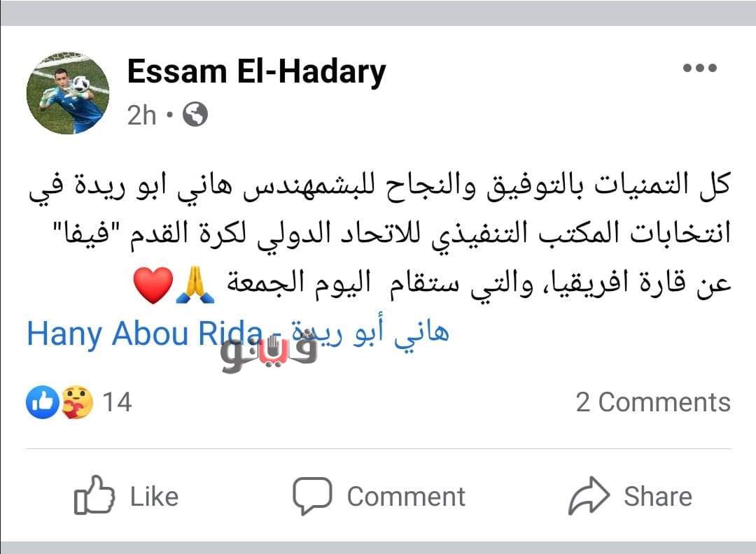 وكتب الحضري عبر حسابه على فيس بوك: كل التمنيات بالتوفيق والنجاح لـ هاني أبو ريدة في انتخابات المكتب التنفيذي للاتحاد الدولي لكرة القدم "فيفا" عن قارة أفريقيا .