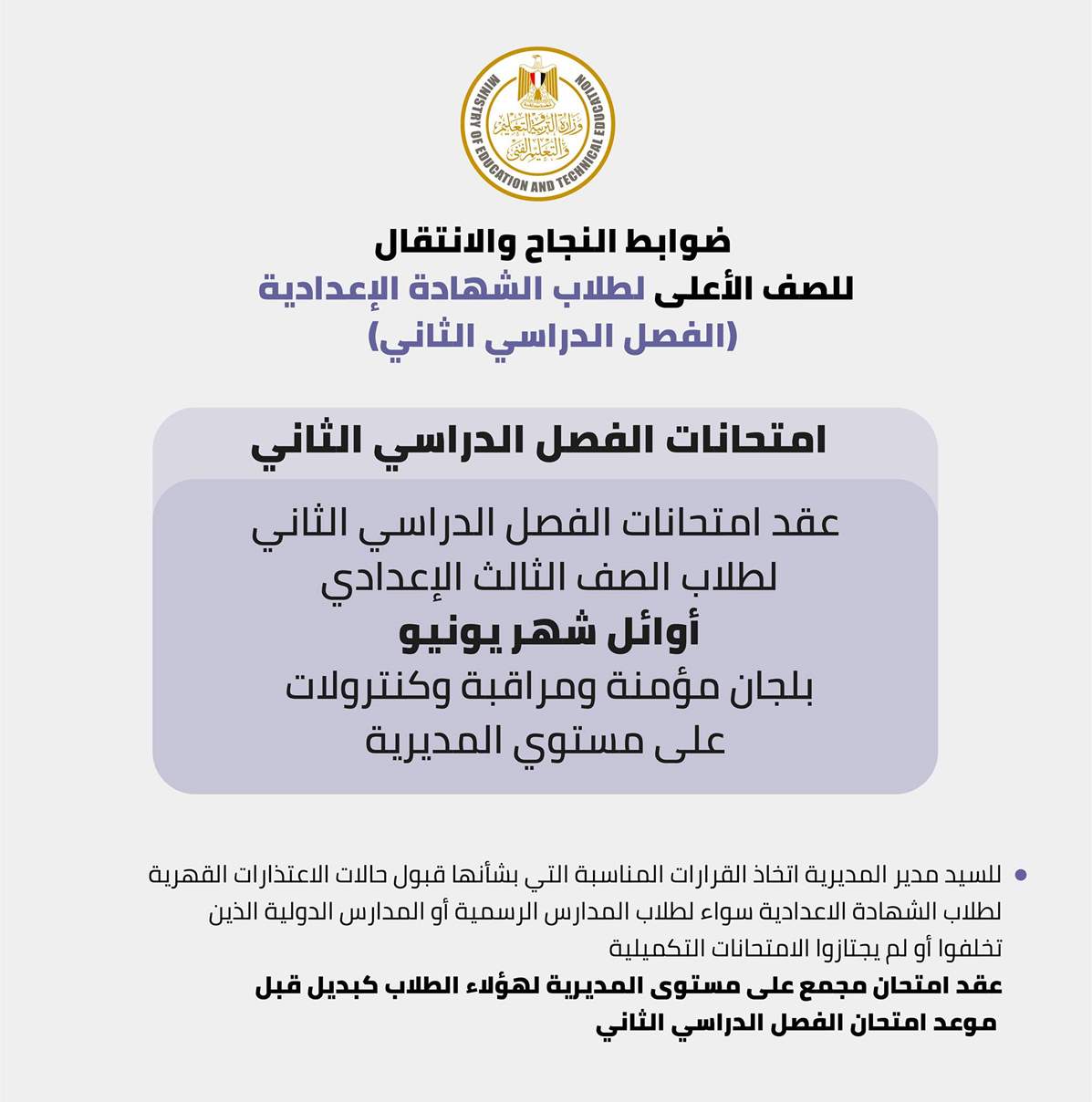 أما بالنسبة للشهادة الإعدادية خلال الفصل الدراسي الثاني فتعقد الامتحانات لطلاب الصف الثالث الإعدادي أوائل شهر يونيو بلجان مراقبة ومؤمنة وكنترولات على مستوى الجمهورية وفق الاجراءات المتبعة.