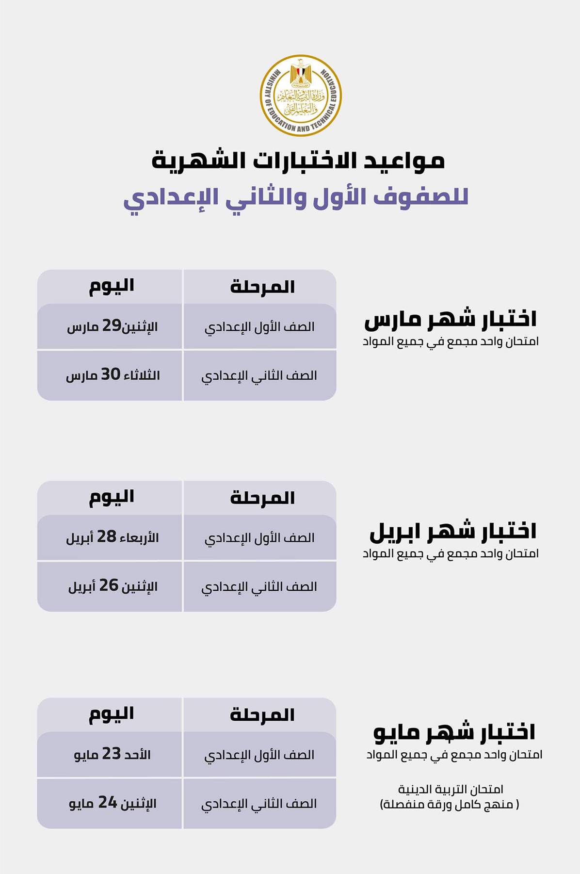 مواعيد اختبارات شهر مايو للصفوف الأول والثاني الإعدادي: