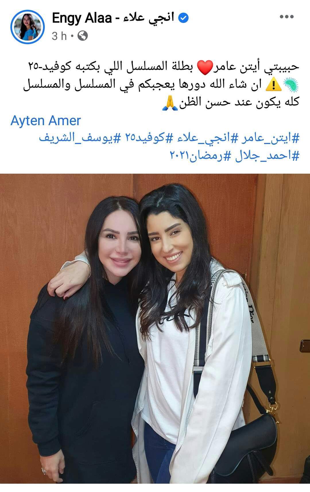 نشرت الكاتبة إنجي علاء عبر صفحتها الشخصية على موقع التواصل الاجتماعي "فيس بوك" صورة تجمعها بالفنانة أيتن عامر من كواليس تصوير مسلسل كوفيد 25 للنجم يوسف الشريف.