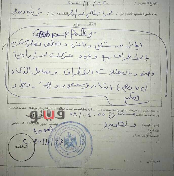 Palsy وكهرباء زائدة بالمخ واضطرابات أخرى)، استغاثة إلى الرئيس السيسي، للتكفل