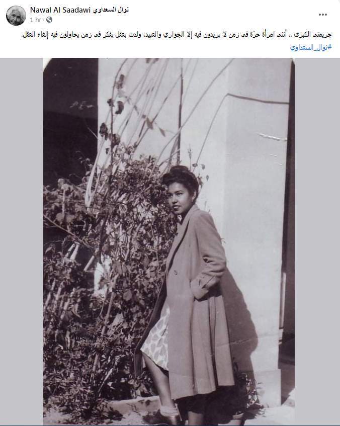 وكتبت نوال السعداوي عبر حسابها على الفيس بوك "جريمتي الكبرى.. أنني امرأة حرّة في زمن لا يريدون فيه إلا الجواري والعبيد، ولدت بعقل يفكر في زمن يحاولون فيه إلغاء العقل. #نوال_السعداوي"
