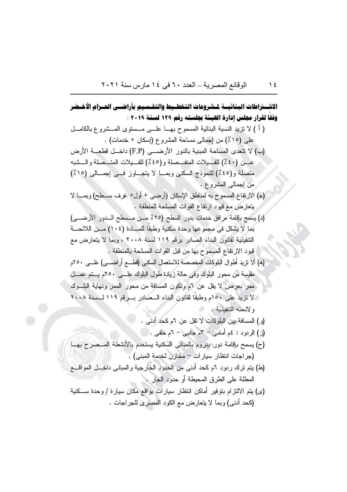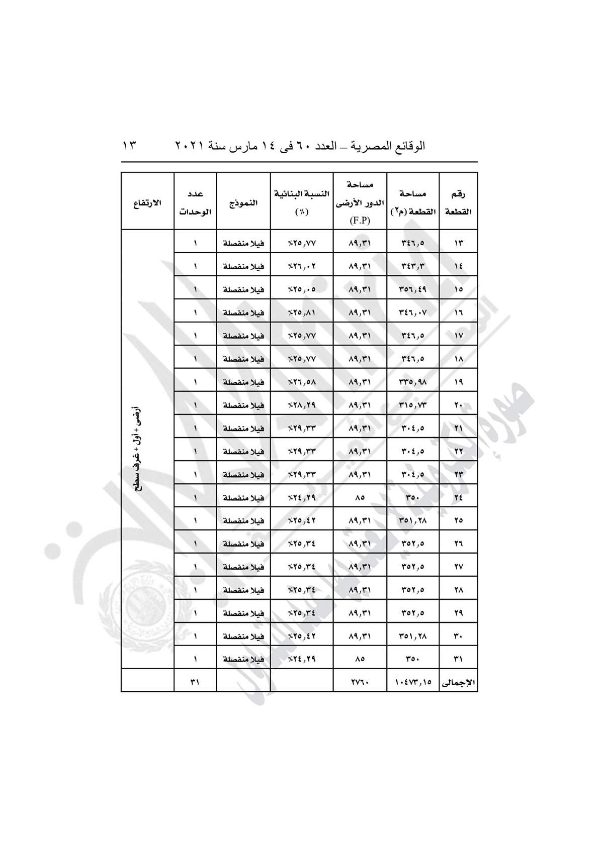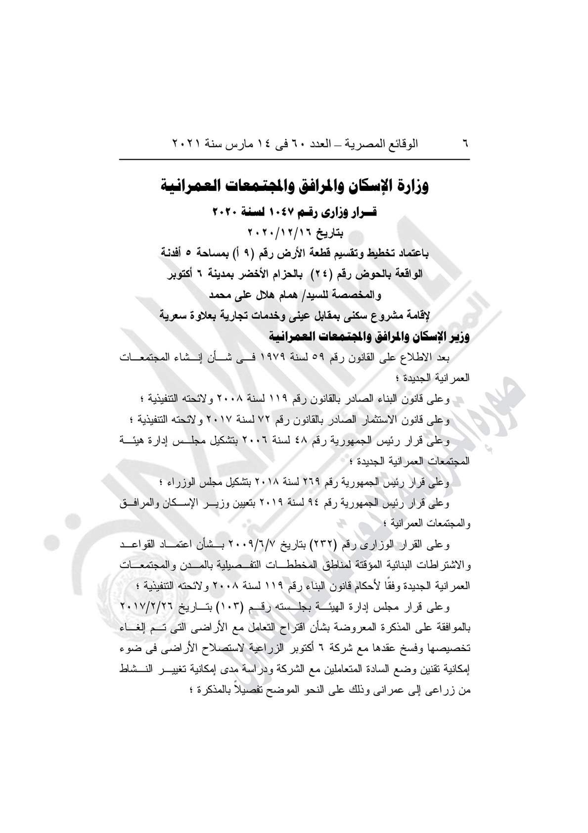 نشرت جريدة الوقائع المصرية في عددها رقم 60، الصادر في 14 مارس 2021، قرار وزارة الإسكان والمرافق والمجتمعات العمرانية رقم 1047 لسنة 2021، باعتماد تخطيط وتقسيم قطعة الأرض رقم (9 أ) بمساحة 5 أفدنة الواقعة بالحوض رقم (24) بالحزام الأخضر بمدينة 6 أكتوبر، لإقامة مشروع سكنى بمقابل عينى وخدمات تجارية بعلاوة سعرية.