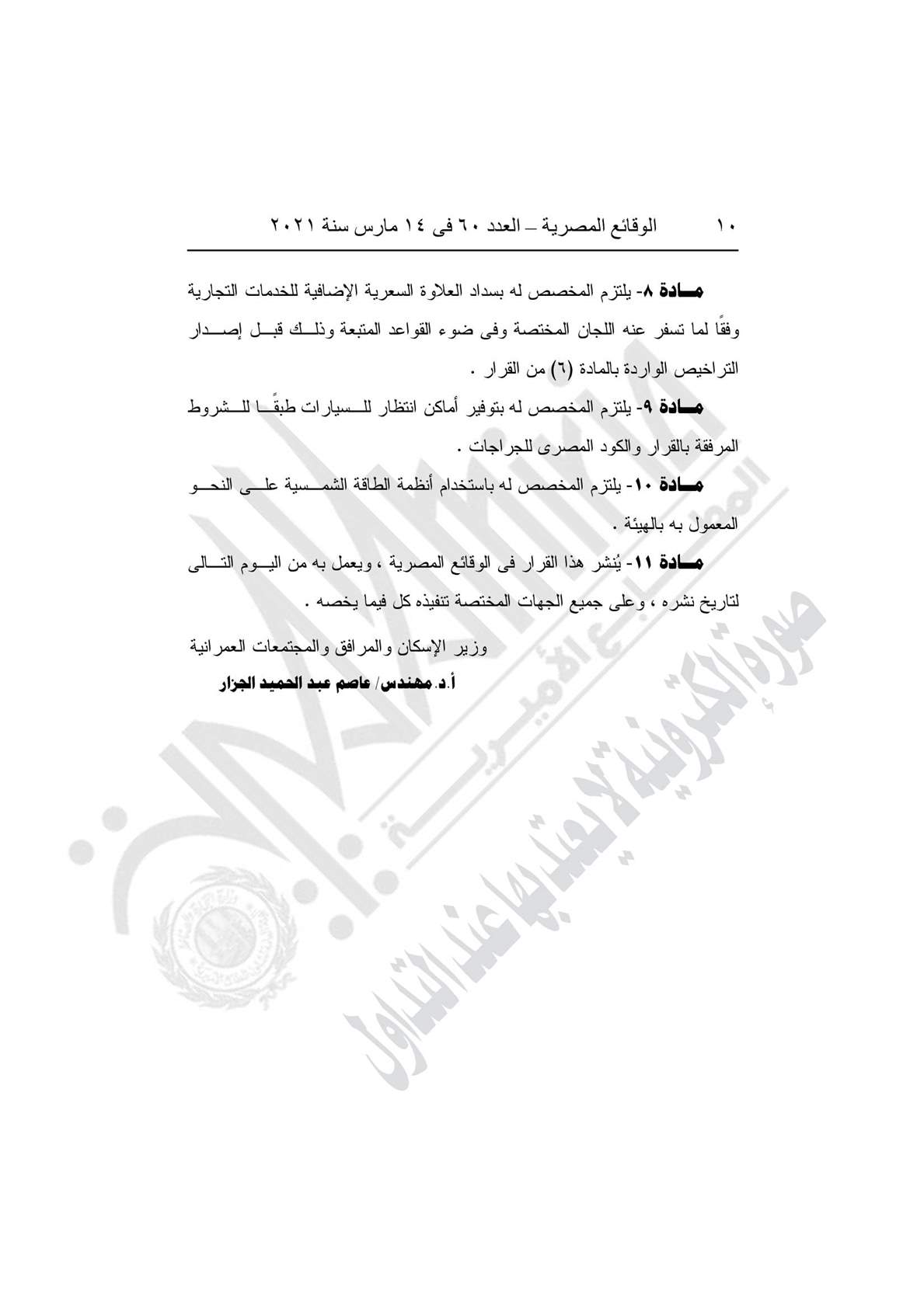 على أن يلتزم المخصص له بموافاة جهاز المدينة المختص بالمستندات اللازمة لاستخراج التراخيص طبقًا لأحكام قانون البناء الصادر بالقانون رقم 119 لسنة 2008 ولائحته التنفيذية .
