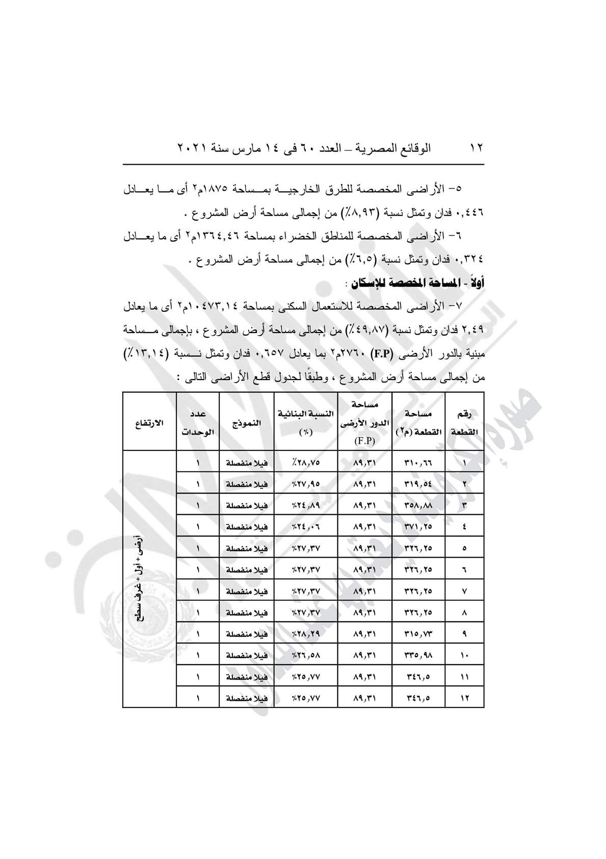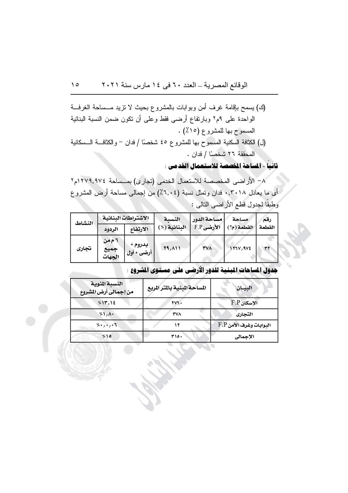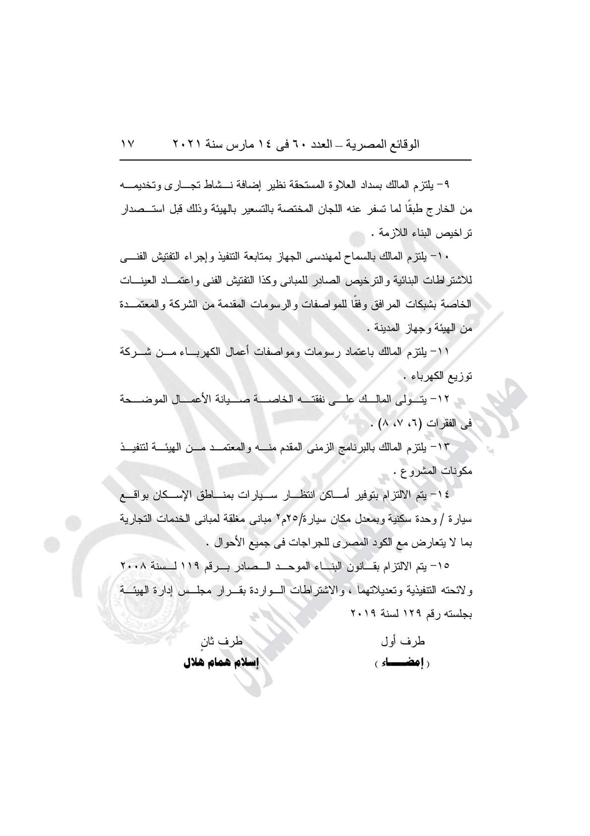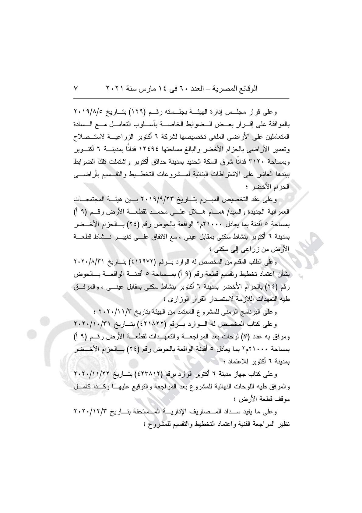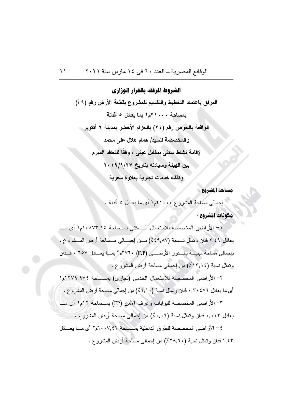 وتنص المادة الأولى للقرار على أن يعتمد تخطيط وتقسيم قطعة الأرض رقم (9 أ) بمساحة 5 أفدنة بما يعادل 21000م2، الواقعة بالحوض رقم (21) بالحزام الأخضر بمدينة 6 أكتوبر والمخصصة لـ همام هلال على محمد، لإقامة مشروع سكنى بمقابل عينى وخدمات تجارية بعلاوة سعرية؛ وذلك طبقًا للحدود الموضحة على الخريطة المرفقة بهذا القرار والعقد المبرم بتاريخ 23/9/2019 والتى تعتبر جميعها مكملة لهذا القرار.