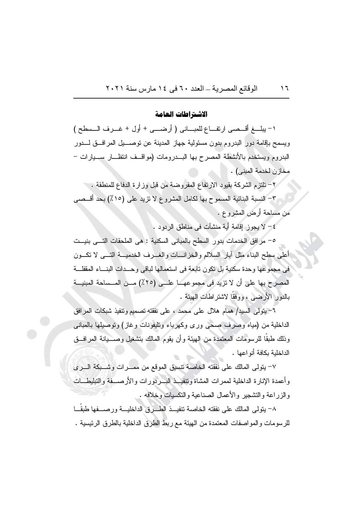 ويلتزم المخصص له أيضًا بالاشتراطات البنائية المعمول بها كحد أقصى وبشرط عدم تجاوز قيود الارتفاع المسموح بها من قبل وزارة الدفاع، مع تقديم الرسومات التنفيذية والمواصفات الفنية لأعمال شبكات المرافق فى إطار المخطط المقدم والمساحة المتعاقد عليها والبرنامج الزمنى المعتمد لدراستها واعتمادها من الهيئة قبل البدء فى التنفيذ.
